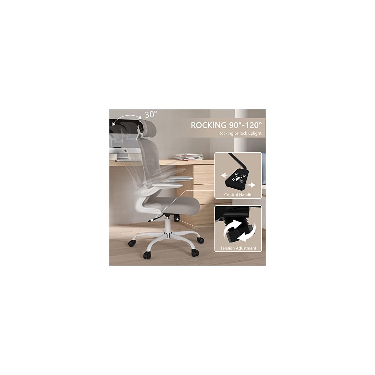 Breathable mesh fabric for all-day comfort, headrest for neck support, and padded armrests to reduce upper body tension.