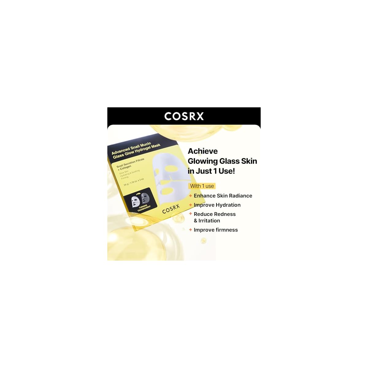 This hydrogel mask, formulated with 25% Snail Secretion Filtrate (Mucin), turns transparent as it delivers active ingredients into the skin. It deeply moisturizes the skin, enhances radiance, soothes sensitive skin, and softens the skin's texture.