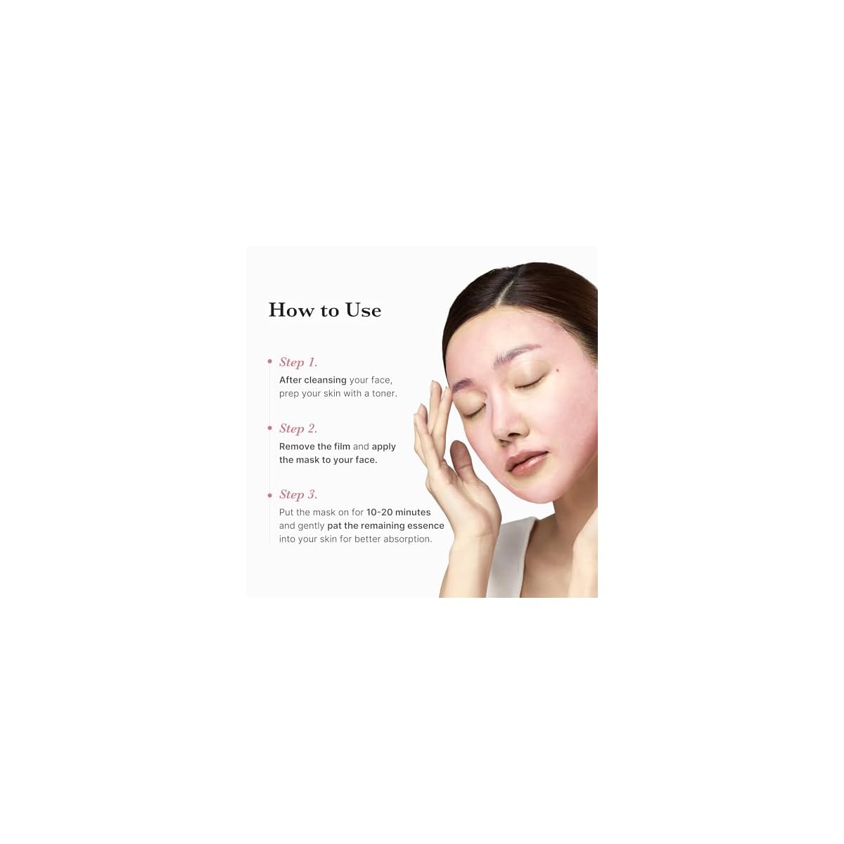 How to use - 1. After cleansing your face, prep your skin with a toner. 2. Remove the film and apply the mask to your face, ensuring it adheres perfectly to your skin. 3. Wait for 10-20 minutes. 4. Gently pat the remaining essence into your skin for better absorption.