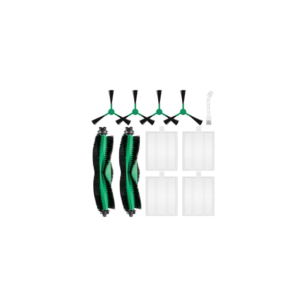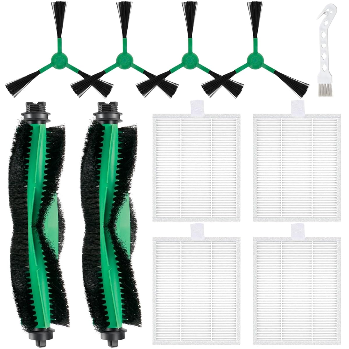 The package includes 2 Roller Brush, 4 Hepa Filters, 4 Side Brushes, 1 Cleaning Brush compatible with iRobot Roomba Essential Series Robot Vacuum Cleaner.